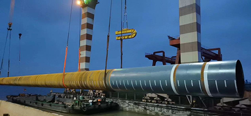 中鐵大橋局汕頭牛田洋項目螺旋鋼管樁,規格為φ3350×25/36mm、φ3144×22mm、φ2840×20mm ,材質為Q355C,單支最長37.9米,總重量約18000噸。鋼管樁樁頂以下15米范圍進行防腐處理,防腐采用熔結環氧粉末工藝,防腐厚度為500μm。由于我司已有五年以上大口徑螺旋和直縫鋼管樁的生產經驗,生產工藝技術非常成熟,生產員工也有豐富的實際工作經驗,產品質量穩定可靠,已經持續供貨12船鋼管樁,用戶非常滿意。